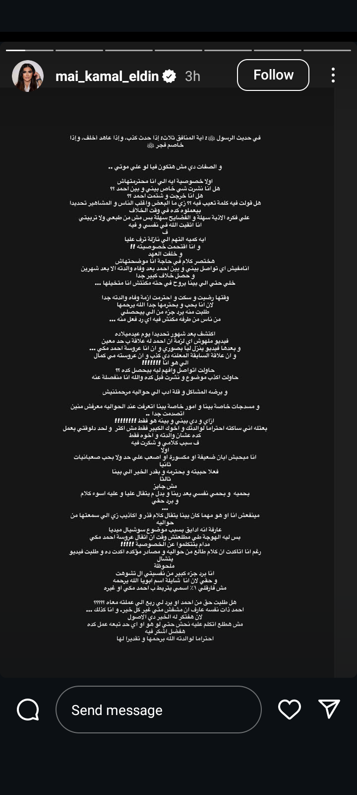 وفي تصريحات جريئة، قالت: حاولت التواصل وفهم ليه بيحصل كده؟ حاولت أكتب موضوع ونشرت قبل كده والله أنا منفصلة عنه وبرضه المشاكل وقلة أدب من اللي حواليه مرحمتنيش، ومسدجات خاصة بينا وأمور خاصة بينا اتعرفت عند اللي حواليه معرفش منين أنا اتصدمت جدًا، إزاي ودي بيني وبينه هو فقط، بعتله إني ساكتة احتراما لوالدته وأخوه الكبير فقط مش أكتر، ولحد دلوقتي بعمل كده علشان والدته وأخوه فقط فسبب كلامي، وأنا مبحبش أبان ضعيفة أو مكسورة أو أصعب على حد ولا بحب الصعبانيات، فعلا بحترمه وبقدر الخير الى بينا.