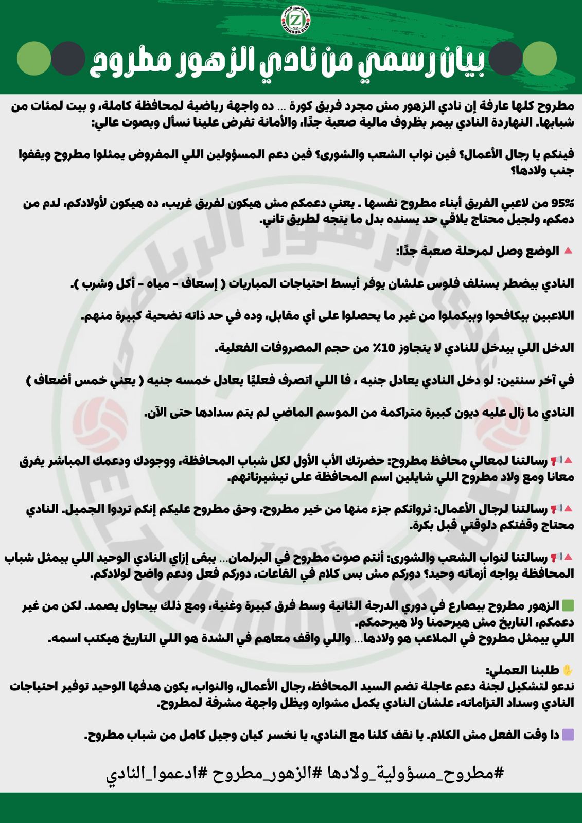 وشمل بيان مجلس إدارة نادي الزهور بمطروح أن النادي ليس فريق كرة قدم فقط بل يعد واجهة رياضية لأبناء وشباب محافظة مطروح والذي يمر بظروف مالية صعبة تفرض علي الجميع من محبي وأبناء المحافظة التدخل لإنقاذ النادي من الضياع خاصة رجال الأعمال والمسؤلين عن الرياضة لدعم النادي الذي يضم نسبة تفوق 95% من اللاعبين به من أبناء محافظة مطروح الذين سبوجه لهم الدعم وليس لأحد من خارج المحافظة.