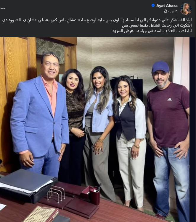 وكتبت الإعلامية أيات أباظة، في منشور على موقع فيسبوك: قال خذها ولا تخف سنعيدها سيرتها الأولى، وقبلها كتبت وإذا مرضت فهو يشفين، ليعلق عليها زوجها السيناريست عمرو محمود ياسين ربنا يشفيكي ويعافيكي يارب.