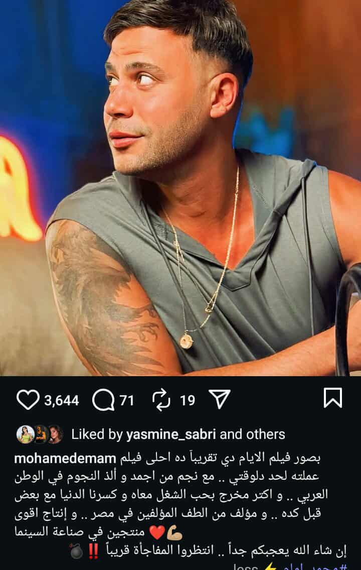 حرصت الفنان محمد إمام على الترويج لفيلمه الجديد الذي يصوره في الفترة الحالية، دون الكشف عن اسمه أو أي تفاصيل خاصة به، مشيرا إلى أنه يتعاون خلاله مع مع أشطر النجوم في الوطن العربي، وأقوى المنتجين في صناعة السينما.