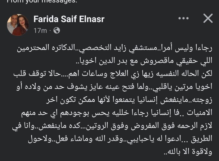 ناشدت الفنانة فريدة سيف النصر المسؤولين في منشور مؤثر عبر حساباتها على مواقع التواصل الاجتماعي، طالبت فيه بالسماح لعائلة شقيقها “بدر الدين” بزيارته داخل مستشفى زايد التخصصي، حيث يمر بظرف صحي بالغ الخطورة بعد تعرض قلبه للتوقف مرتين.
