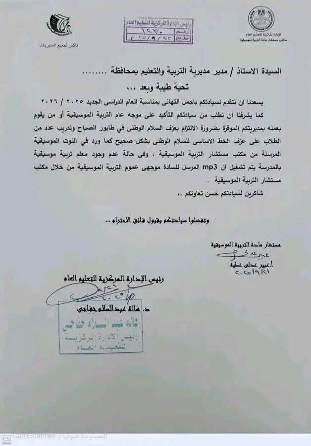 أكدت وزارة التربية والتعليم والتعليم الفني على جميع المدارس بضرورة الالتزام بعزف السلام الوطني في طابور الصباح، مع ترديد النشيد من الطلاب والمعلمين، بما يعزز قيم الانتماء والولاء للوطن.