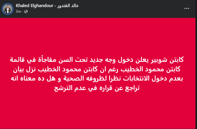 وأردف شوبير قائلاً:” ولكن أحد أعضاء مجلس الإدارة قال لي إنه لا يعرف شيئ عن ترشح الخطيب”.