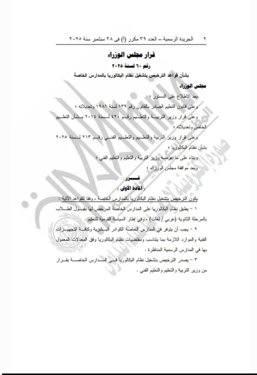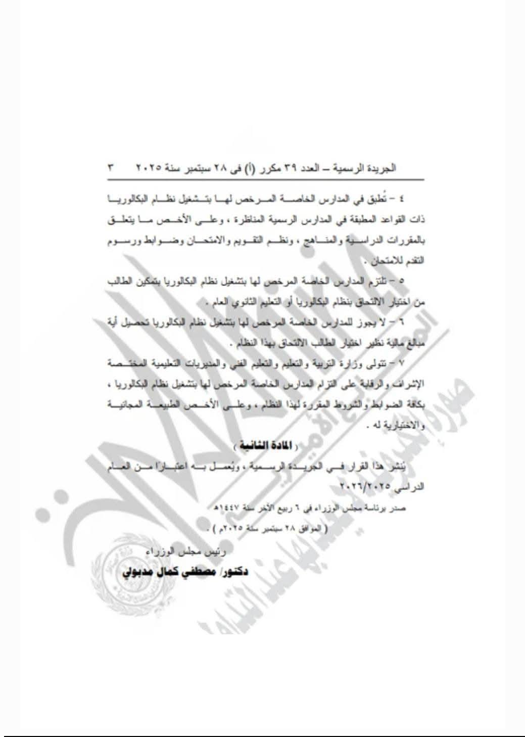 نشرت الجريدة الرسمية قرار الدكتور مصطفى مدبولي رئيس مجلس الوزراء، رقم ٦٠ لسنة 2025، بشأن قواعد الترخيص بتشغيل نظام البكالوريا بالمدارس الخاصة، للعام الدراسي الجاري 2025/2026.
