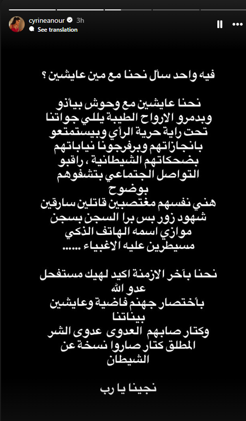 وتابعت سيرين عبد النور: تابعوا التواصل الاجتماعي بتشفوهم بوضوح، هما نفسهم مغتصبيتن، قاتلين، شهود زور بس برا السجن بسجن موازي اسمه الهاتف الذكي مسيطرين عليه الاغبياء.