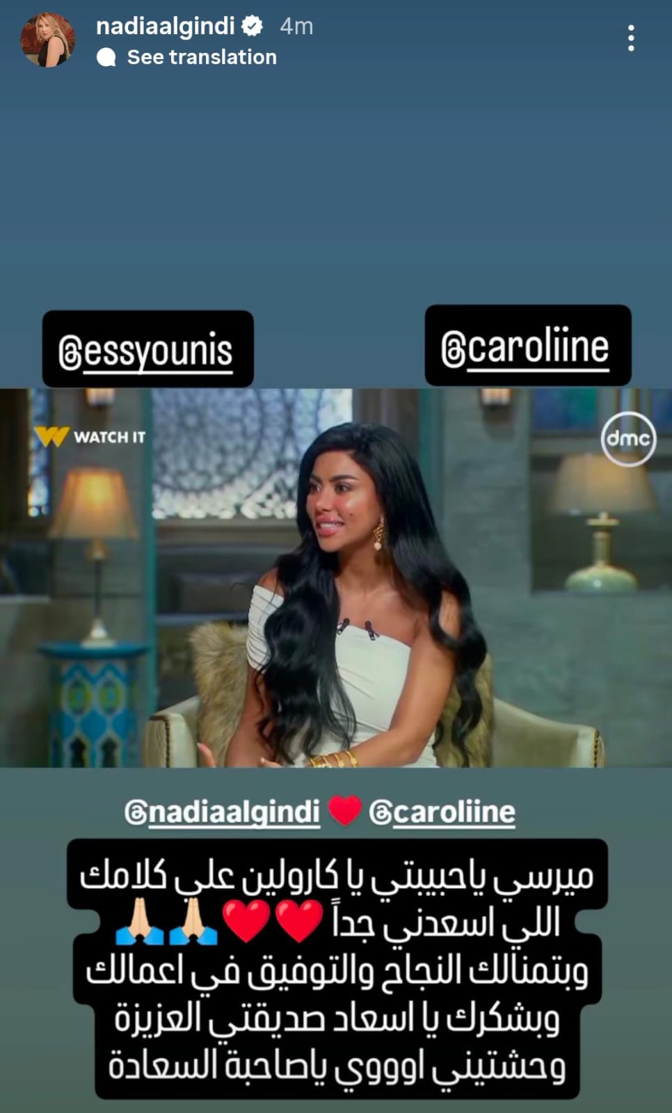 ردت الفنانة نادية الجندي، على تصريحات الفنانة كارولين عزمي، وذلك خلال لقائها في برنامج صاحبة السعادة، من تقديم الإعلامية إسعاد يونس، والتي قالت خلالها انها احب التمثيل بسببها وكانت تحلم ان تكون مثلها.
