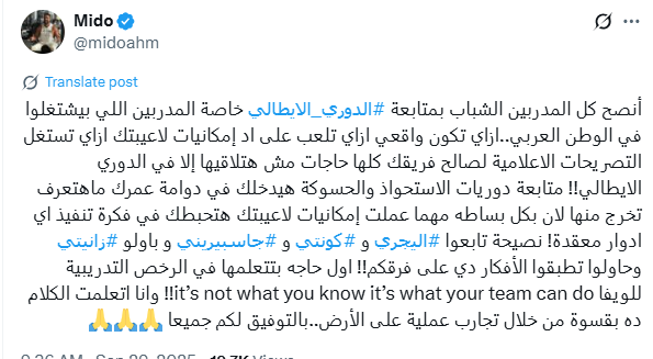 وأختتم قائلاً:” نصيحة تابعوا اليجري و كونتي و جاسبيريني و باولو زانيتي وحاولوا تطبقوا الأفكار دي على فرقكم اول حاجه بتتعلمها في الرخص التدريبية للويفا it’s not what you know it’s what your team can do وانا اتعلمت الكلام ده بقسوة من خلال تجارب عملية على الأرض .بالتوفيق لكم جميعا”.