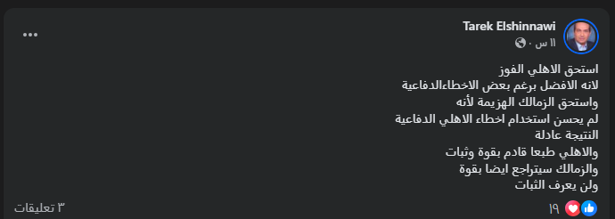 وتابع الناقد الفني طارق الشناوي، ان المباراة انتهت بنتيجة منطقية وان الاهلي يسير بثبات وقوة في طريقه، بينما الزمالك يحتاج لمراجهة نفسه من أجل العودة: الزمالك سيتراجع أيضا بقوة ولن يعرف الثبات.