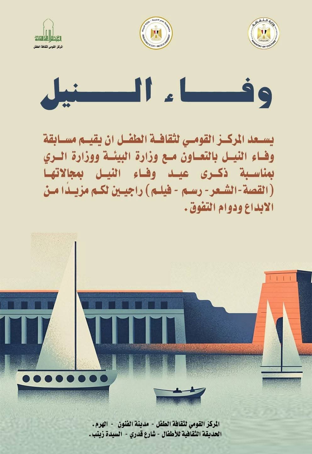 تحت رعاية الدكتور أحمد فؤاد هنو وزير الثقافة، وإشراف الدكتور أشرف العزازي أمين عام المجلس الأعلى للثقافة، يعلن المركز القومي لثقافة الطفل برئاسة الباحث أحمد عبد العليم أسماء الفائزين في مسابقة “وفاء النيل” في دورتها الأولى لعام ٢٠٢٥ بالتعاون مع وزارة البيئة ووزارة الري.