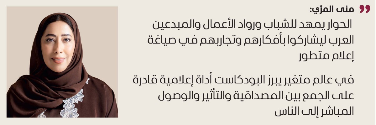 وأضافت: «يأتي انعقاد هذا الحوار في وقت يزداد فيه إقبال المتابع العربي على البودكاست، كونه يتمتع بميزة فريدة في سهولة إيصال الأفكار. وفي العالم الرقمي سريع التغير، يبرز هذا الشكل كونه أداة إعلامية قادرة على الجمع بين المصداقية والتأثير والوصول المباشر إلى الناس، مستمداً مقومات نموه من التطور الهائل في البيئة الرقمية التي تسعى دبي لتكون في صدارتها..