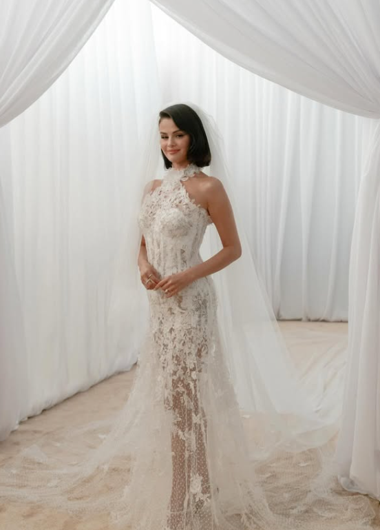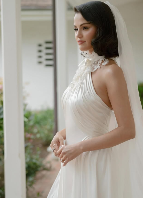 وكانت الفنانة العالمية سيلينا غوميز، قد أطلت في حفل زفافها على المنتج بيني بلانكو، بفستان جمع بين البساطة والكلاسيكية، من تصميم رالف لورين، حيث تصميمه خصيصا ليتوافق مع اسلوبها وذوقها الذي يميل للأسلوب الكلاسيكي، فجاء الفستان من عند الرقبة بلياقة هالتر مع وجود الورود البارزة، وعند الصدر تداخل الدانتيل.