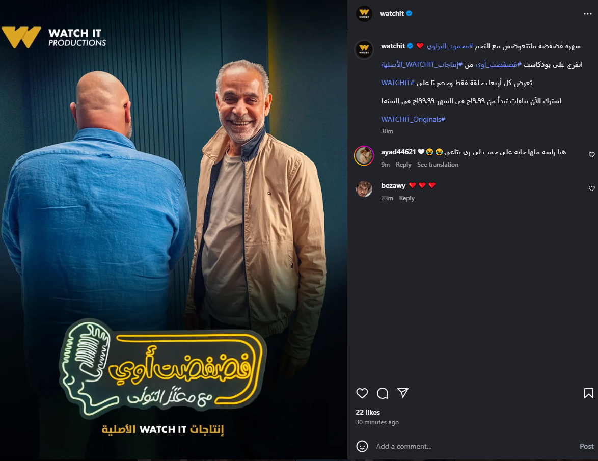 يستعد الفنان محمود البزاوي، للحلول ضيفا على برنامج فضفضت أوي، من تقديم المخرج معتز التوني، والذي يتم عرضه عبر شاشة منصة watch it، حيث يعد من أعمالها الاصلية.