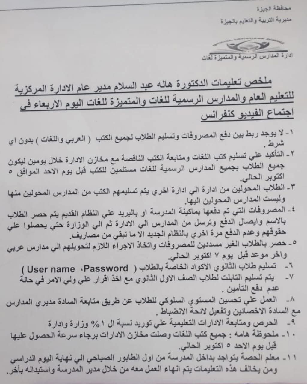 2.  التأكيد علي تسليم كتب اللغات ومتابعة الكتب الناقصة مع مخازن الإدارة خلال يومين ليكون جميع الطلاب بجميع المدارس الرسمية للغات مستلمين للكتب قبل يوم الأحد الموافق 5 اكتوبر الحالي.