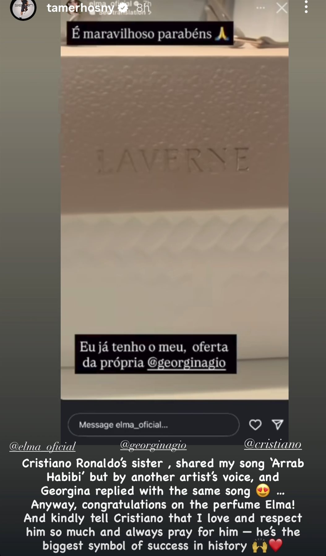 عبّر الفنان تامر حسني عن سعادته الكبيرة بعد أن تم تداول أغنيته الشهيرة قرب حبيبي من قِبل زوجة وشقيقة نجم كرة القدم العالمي كريستيانو رونالدو، وهما جورجينا رودريغيز شريكة حياته وشقيقته.