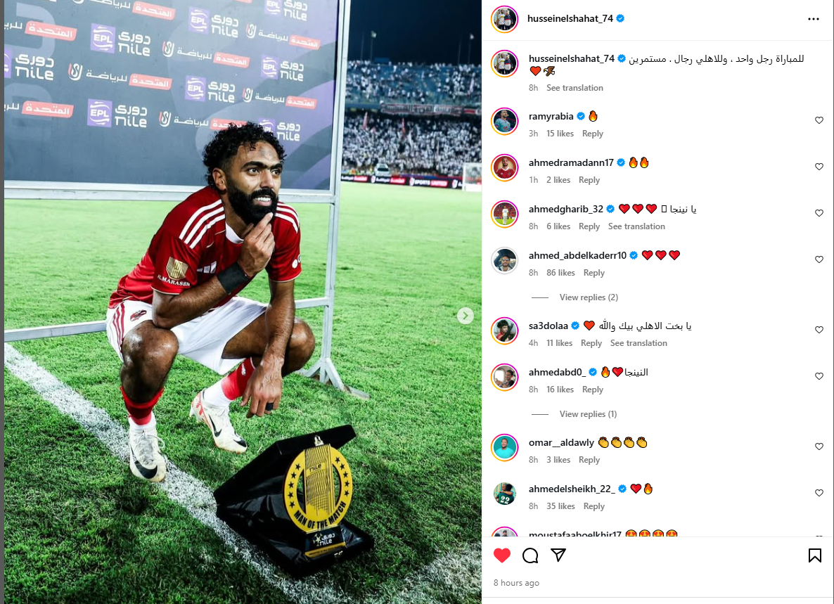يواصل حسين الشحات لاعب الفريق الأول لكرة القدم بالنادي الأهلي، احتفال بالفوز على نادي الزمالك فى قمة الدوري المصري.