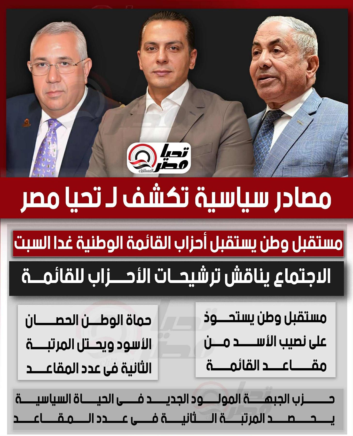 وأوضحت المصادر أن الاجتماع سيشهد مناقشات حول نسب تمثيل كل حزب داخل القائمة، مشيرة إلى أن مستقبل وطن يستحوذ على النصيب الأكبر من المقاعد، فيما يبرز حزب حماة الوطن “الحصان الأسود” لهذه الانتخابات باحتلاله المرتبة الثانية من حيث عدد المقاعد المتوقعة. كما لفتت إلى أن حزب الجبهة، باعتباره المولود الجديد في الحياة السياسية، استطاع أن يفرض نفسه على الساحة، وحجز موقعًا متقدمًا في المرتبة الثالثة على مستوى التمثيل داخل القائمة.