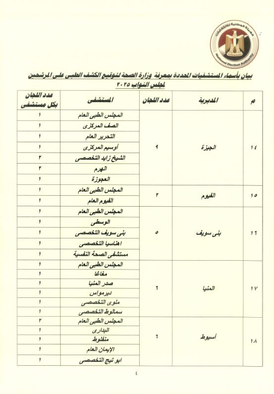 قائمة المستشفيات المعتمدة لإجراء الكشف الطبي لمرشحي مجلس النواب