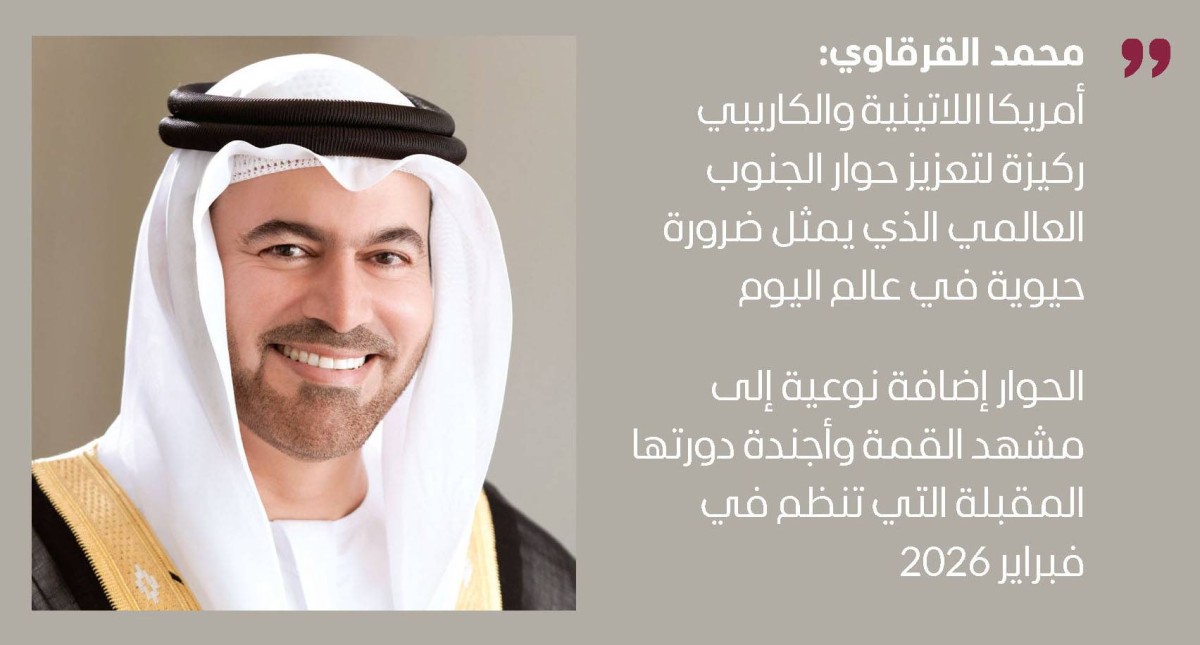 وقال معالي محمد القرقاوي إن منطقة أمريكا اللاتينية والكاريبي تمثل ركيزة مهمة لجهود تعزيز حوار الجنوب العالمي، الذي يمثل ضرورة حيوية في عالم اليوم، في ظل ما يشهده من متغيرات متسارعة وتحديات متصاعدة، تفرض على الحكومات والدول بناء توجهات مشتركة.