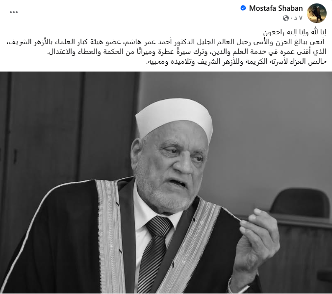 وتابع مصطفى شعبان في منشوره: وترك سيرةً عطرة وميراثًا من الحكمة والعطاء والاعتدال.. خالص العزاء لأسرته الكريمة وللأزهر الشريف وتلاميذه ومحبيه.