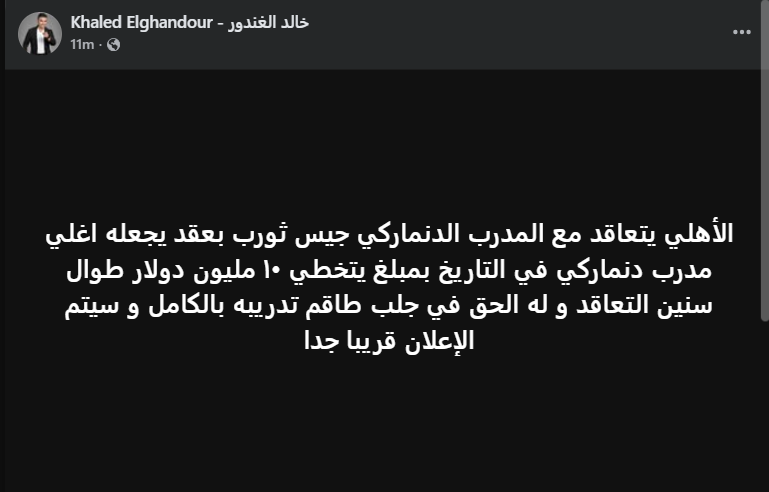 كشف الإعلامي خالد الغندور نجم نادي الزمالك السابق، عن كواليس مفاوضات مسؤولي النادي الاهلي مع الدنماركي جيس ثورب، وذلك من أجل تولي تدريب صفوف الفريق الأول لكرة القدم.