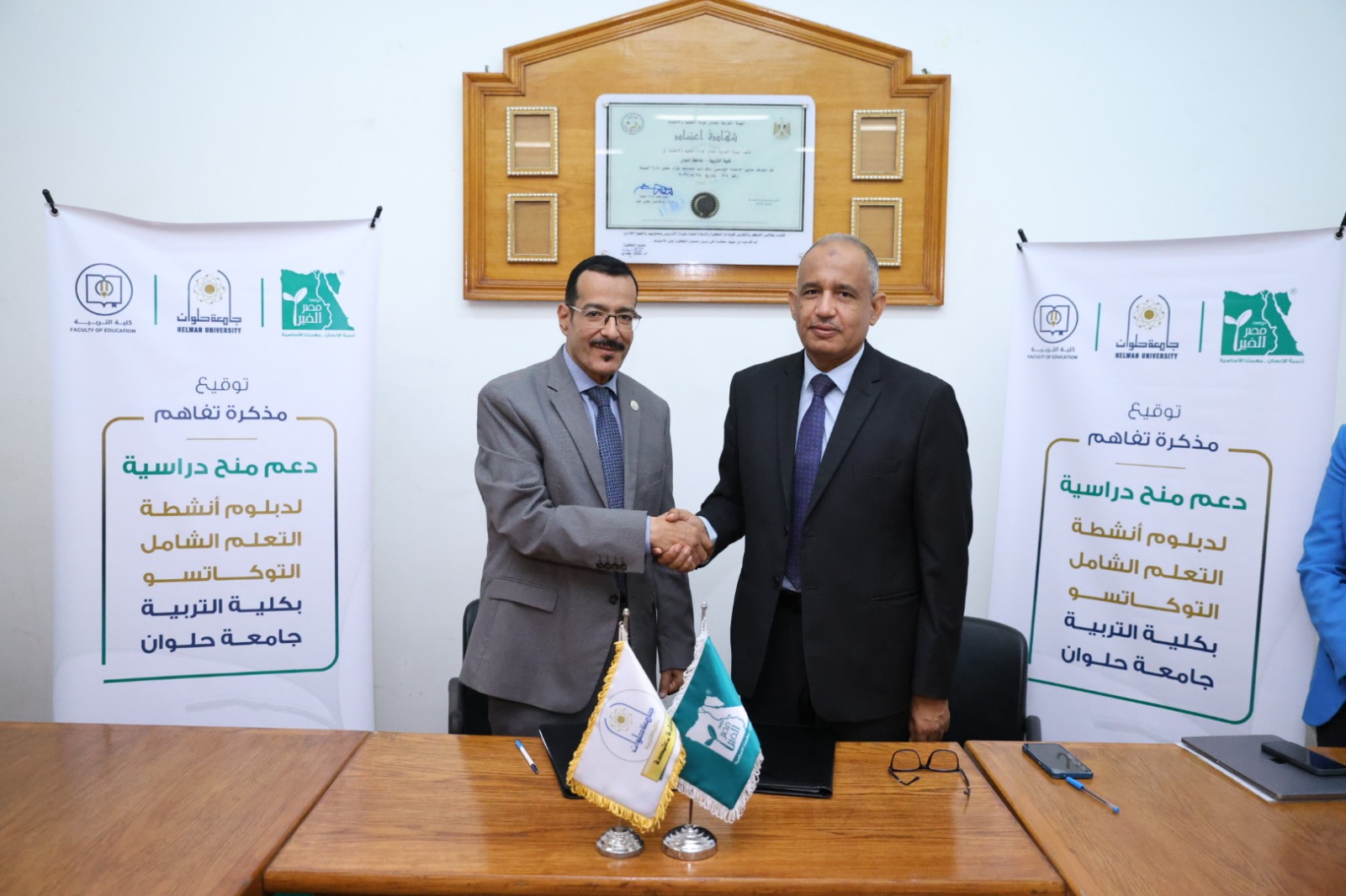 وقّع بروتوكول التعاون كل من الدكتور صابر حسن، رئيس قطاع التعليم بمؤسسة مصر الخير، والدكتور حسام حمدي عبدالحميد، عميد كلية التربية جامعة حلوان. وذلك بحضور الدكتورة أمل سويدان رئيس لجنة قطاع الدراسات التربوية السابق، والدكتورة رشيدة الطاهر وكيل الكلية للدراسات العليا والبحوث، والدكتورة مني ابو هشيمة وكيل الكلية لخدمة المجتمع وتنمية البيئة، والدكتورة لبني شهاب منسق البروتوكول وبرنامج دبلوم التوكاتسو