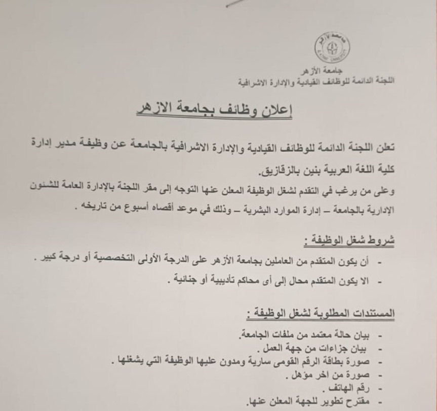 أعلنت اللجنة الدائمة للوظائف القيادية والإدارة الاشرافية بجامعة الأزهر، عن وظيفة مدير إدارة كلية اللغة العربية بنين بالزقازيق.