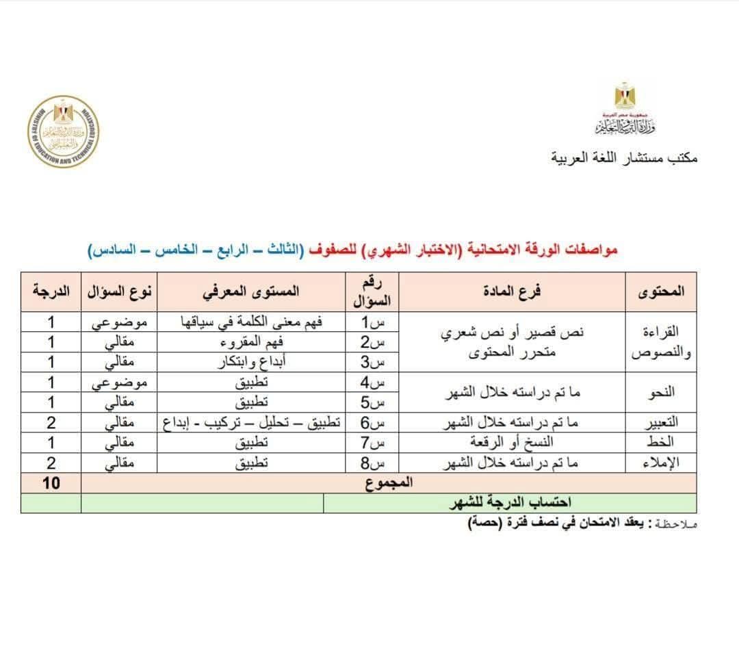 حدد مكتب مستشار اللغة العربية بـ وزارة التربية والتعليم والتعليم الفني، مواصفات امتحان مادة اللغة العربية شهر أكتوبر 2025 لطلاب الثالث والرابع والخامس والسادس الابتدائي، المقرر عقدها نهاية الشهر الجاري والتي تضمنت الآتي:
