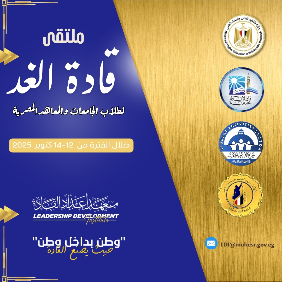 ينظم قطاع الأنشطة الطلابية بوزارة التعليم العالي والبحث العلمي ومعهد إعداد القادة ملتقى “قادة الغد” لطلاب الجامعات والمعاهد المصرية خلال الفترة من 12 حتى 14 أكتوبر 2025، وذلك في ضوء اهتمام الدولة ببناء وعي الشباب وتعزيز الهوية الوطنية، وبتوجيهات الدكتور أيمن عاشور وزير التعليم العالي والبحث العلمي، الهادفة إلى تمكين طلاب الجامعات من قيادة المستقبل بفكر مستنير وروح وطنية واعية.