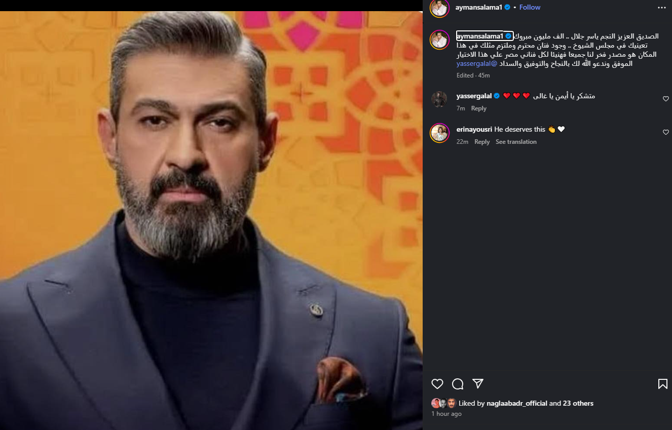 حرص السيناريست أيمن سلامة، عن توجيه التهاني للفنان ياسر جلال، وذلك بعد أُصدر قرار بتعيينه عضوا في مجلس الشيوخ، تقديرا لمسيرته الفنية الحافلة بالأعمال التي تناقش القضايا الوطنية.