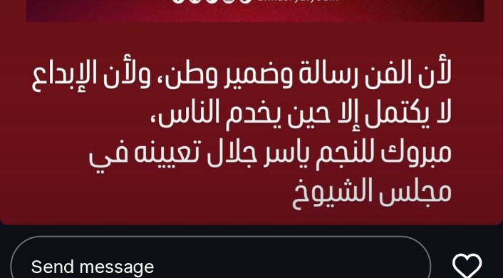 من جانبه كان حرص الفنان ياسر جلال على توجيه الشكر إلى الرئيس عبد الفتاح السيسي عقب صدور قرار تعيينه في مجلس الشيوخ، مؤكدًا اعتزازه بالثقة الكبيرة التي أولاه إياها الرئيس، وأعرب جلال عن سعادته البالغة بهذه الخطوة مشيرًا إلى أن وجود الفنانين داخل المجلس يمثل إضافة مهمة في مناقشة الملفات التي تمس الثقافة والهوية الوطنية، وأضاف في أول تعليق له أن الفن ليس مجرد وسيلة للترفيه، بل هو أداة للتنوير ونشر الوعي، وأنه سيسعى من خلال موقعه الجديد إلى دعم قضايا الفن والإبداع بما يخدم المجتمع المصري.