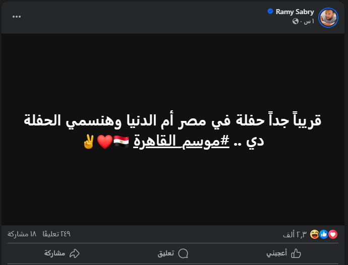 أعلن الفنان رامي صبري، عن إحيائه حفل غنائي جماهيري، خلال الفترة المقبلة، تحت عنوان موسم القاهرة، وذلك عبر صفحته على موقع التواصل فيسبوك.