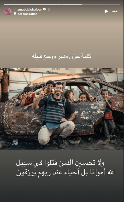 حرصت الفنانة ريهام عبد الغفور، عن نعي الصحفي الفلسطيني، صالح الجعفراوي، الذي استشهد مساء أمس الأحد، وذلك بكلمات مؤثرة معبرة عن مدى حزنها.