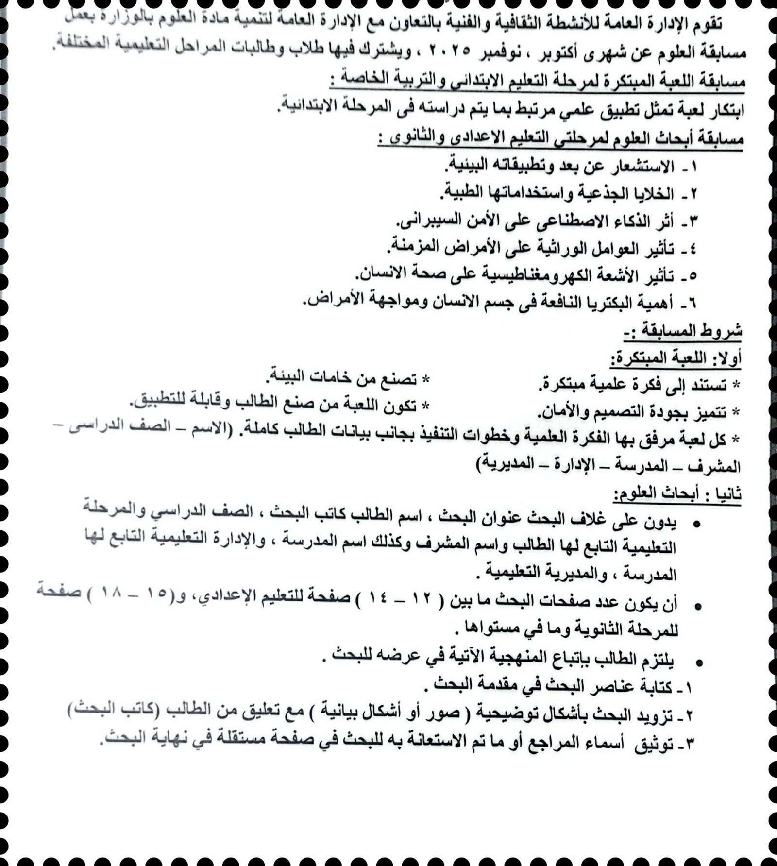 تقوم الإدارة العامة للأنشطة الثقافية والفنية بالتعاون مع الإدارة العامة لتنمية مادة العلوم بوزارة التربية والتعليم والتعليم الفني، بعمل مسابقة العلوم عن شهرى أكتوبر، نوفمبر ۲۰۲۵ ، ويشترك فيها طلاب وطالبات المراحل التعليمية المختلفة.