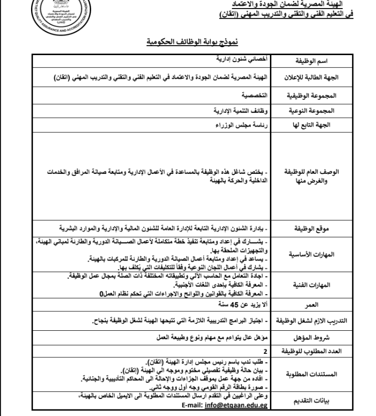 ويتاح التقديم في وظائف الهيئة المصرية لضمان جودة التعليم الفني حتى يوم 2025/11/11، وعلى الراغبين في التقدم ارسال المستندات المطلوبة الى الايميل الخاص بالهيئة