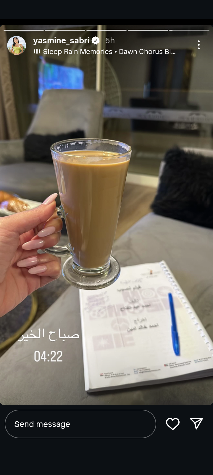 وعن روتين يومها، قالت ياسمين صبري: “فطار الابطال، جيم، غدا الابطال، قراءة أو خروج أو سفر، عشا الابطال”.