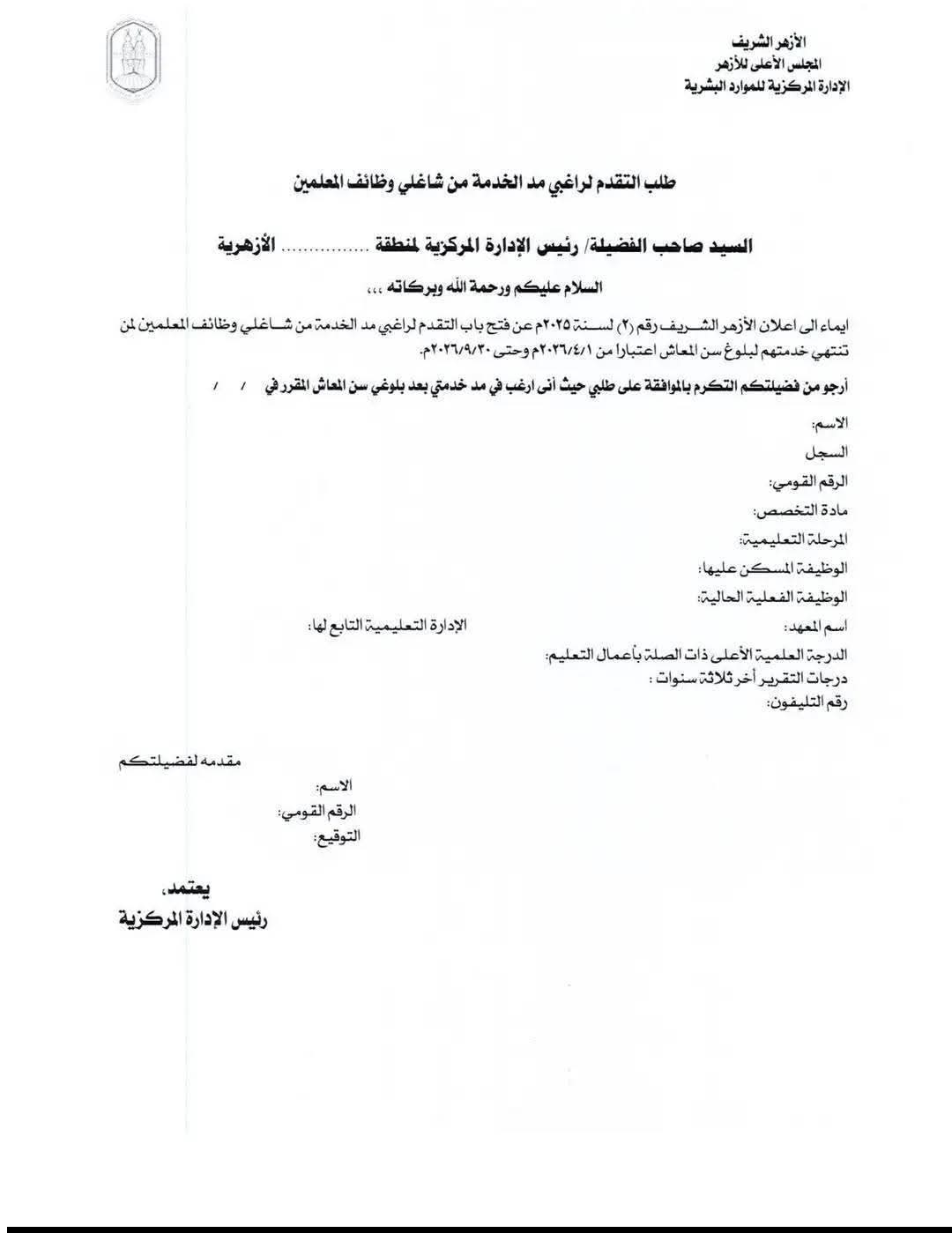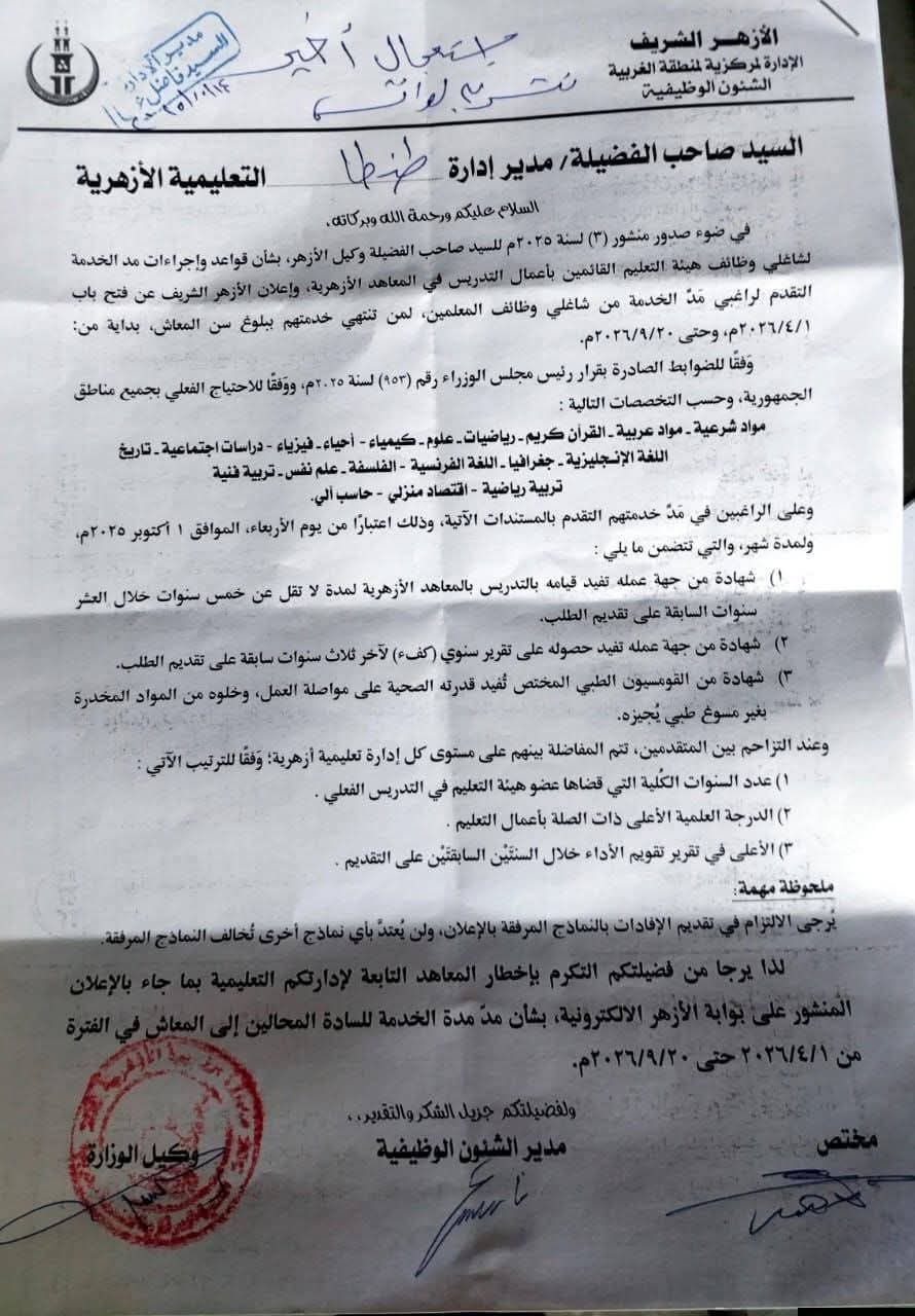 أعلن الأزهر الشريف عن فتح باب التقدم لراغبي مَدِّ الخدمة من المعلمين الذين بلغوا سن المعاش   لمن تنتهي خدمتهم ببلوغ سن المعاش،  بداية من 1 أبريل 2026م، وحتى 20 سبتمبر 2026م؛ وَفقًا للضوابط الصادرة بقرار رئيس مجلس الوزراء رقم (٩٥٣) لسنة ۲۰۲٥م.