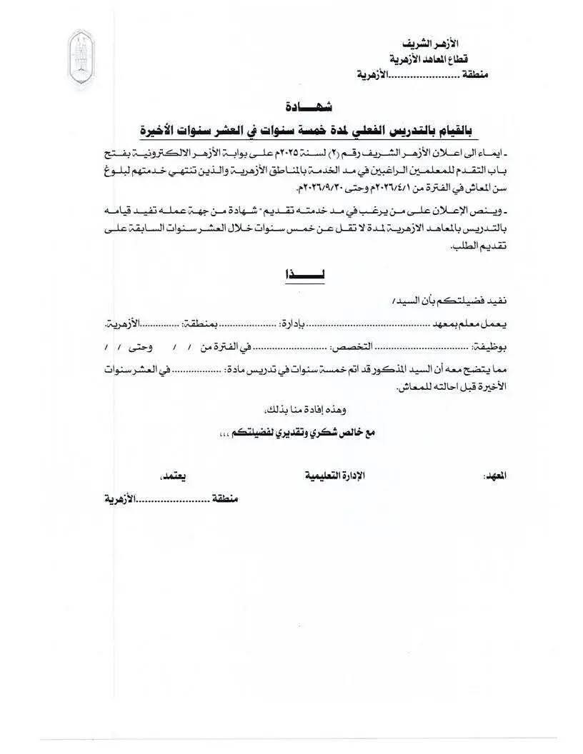• شهادة من جهة عمله تفيد قيامه بالتدريس بالمعاهد الأزهرية لمدة لا تقل عن خمس سنوات خلال العشر سنوات السابقة على تقديم الطلب.