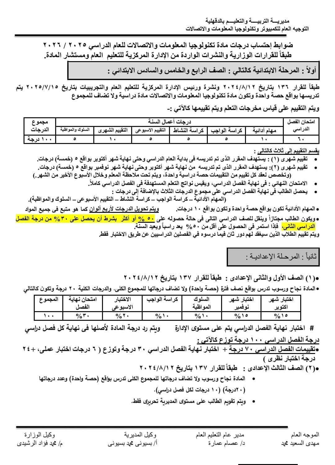 أعلنت وزارة التربية والتعليم والتعليم الفني، ضوابط احتساب درجات مادة تكنولوجيا المعلومات والاتصالات للعام الدراسي ٢٠٢٥ / ٢٠٢٦ طبقًا للقرارات الوزارية والنشرات الواردة من الإدارة المركزية للتعليم العام ومستشار المادة.