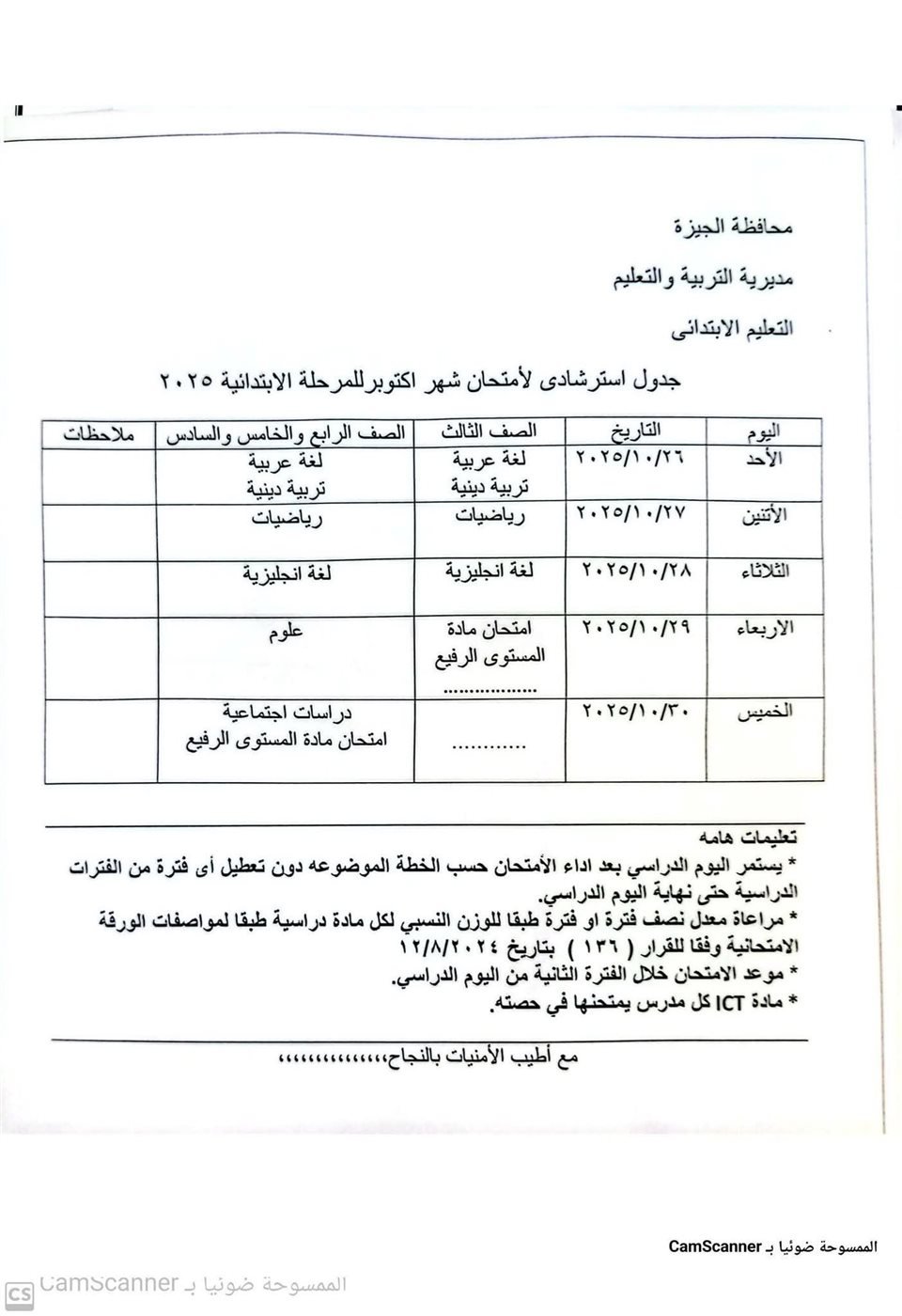 جدول امتحانات شهر أكتوبر رابعة ابتدائي 2025 محافظة الجيزة