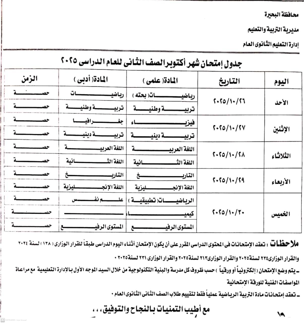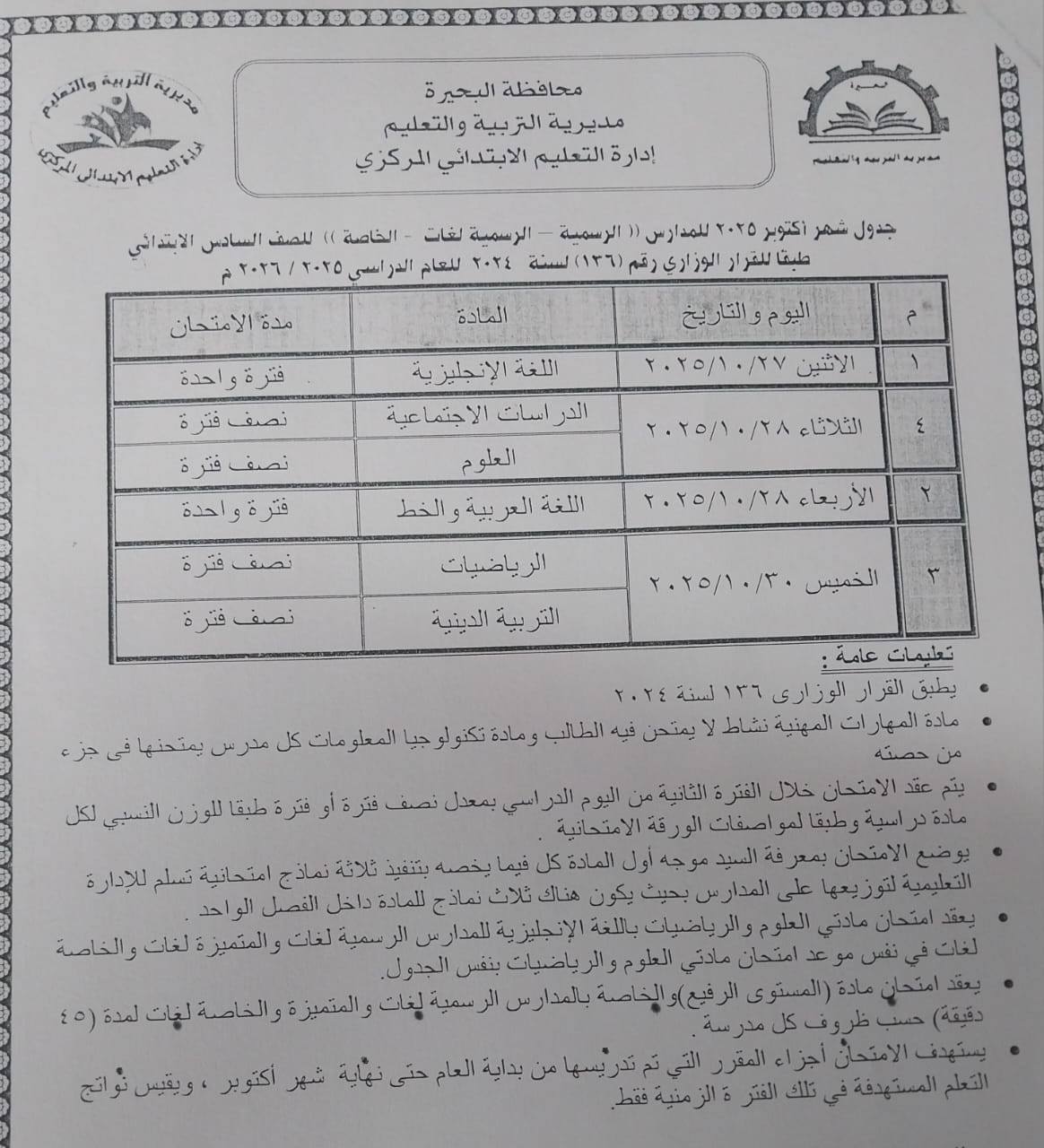 جدول امتحانات شهر أكتوبر 2025 لصفوف النقل البحيرة
