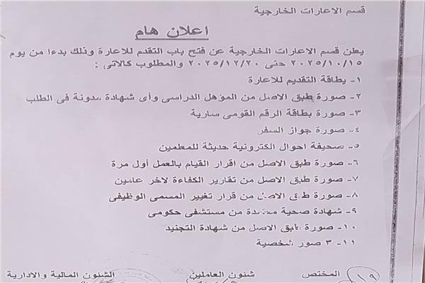 وأعلنت وزارة التربية والتعليم والتعليم الفني عن الأوراق المطلوبة للتقديم إعارة المعلمين للعام الدراسي الحالي 2025-2026، كما يلي، وهي التي تأتي على النحو التالي:.