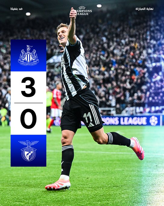 وانتهت مباراة نيوكاسل يونايتد وبنفيكا في دوري أبطال أوروبا بفوز الفريق الإنجليزي بثلاثية نظيفة.