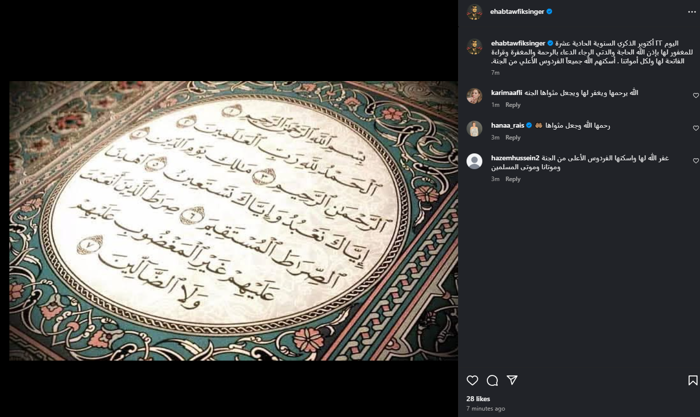 حرص الفنان إيهاب توفيق، على إحياء الذكرى 11 لوفاة والده، وذلك من خلال رسالة مؤثرة لها، داعيا الله ان يغفر لها ويرحمها، وذلك عبر موقع الفيديوهات والصور القصيرة إنستجرام.