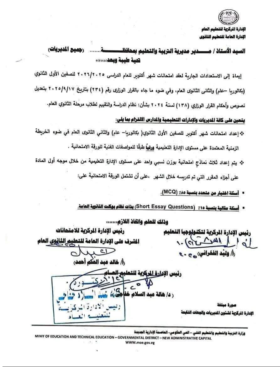وأشارت الوزارة إلى أنه يتم إعداد امتحانات شهر أكتوبر للصفين الأول الثانوي ( بكالوريا – عام) والثاني الثانوى العام في ضوء الخريطة الزمنية المعتمدة على مستوى الإدارة التعليمية ورقيًا طبقا للمواصفات الفنية للورقة الامتحانية.