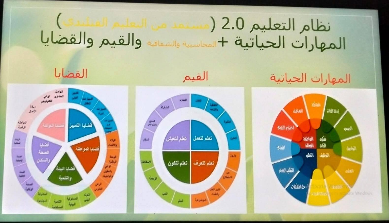 القيم والقضايا، تم التأكيد على أهمية غرس القيم الإيجابية لدى الطلاب، كاحترام الآخر، والمواطنة، والانتماء، والتسامح، إلى جانب تناول القضايا المعاصرة التي تؤثر على المجتمع، مثل ( التغير المناخي – الأمن الرقمي – الاستدامة البيئية – تعزيز ثقافة السلام ونبذ العنف )