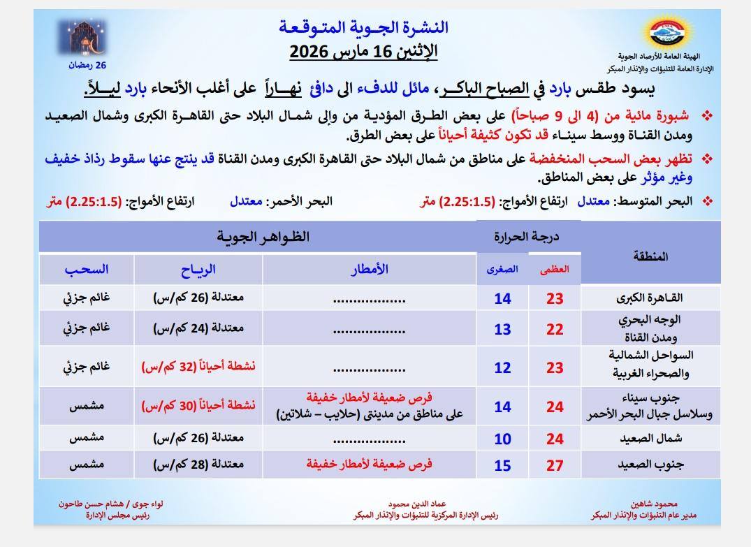 تتوقع الهيئة العامة للأرصاد الجوية أن يشهد غداً الاثنين الموافق 16 مارس 2026 طقساً بارداً في الصباح الباكر ومائلاً للدفء إلى دافئ نهاراً على أغلب الأنحاء بينما تسود أجواء باردة ليلاً وفي ساعات الصباح الأولى.