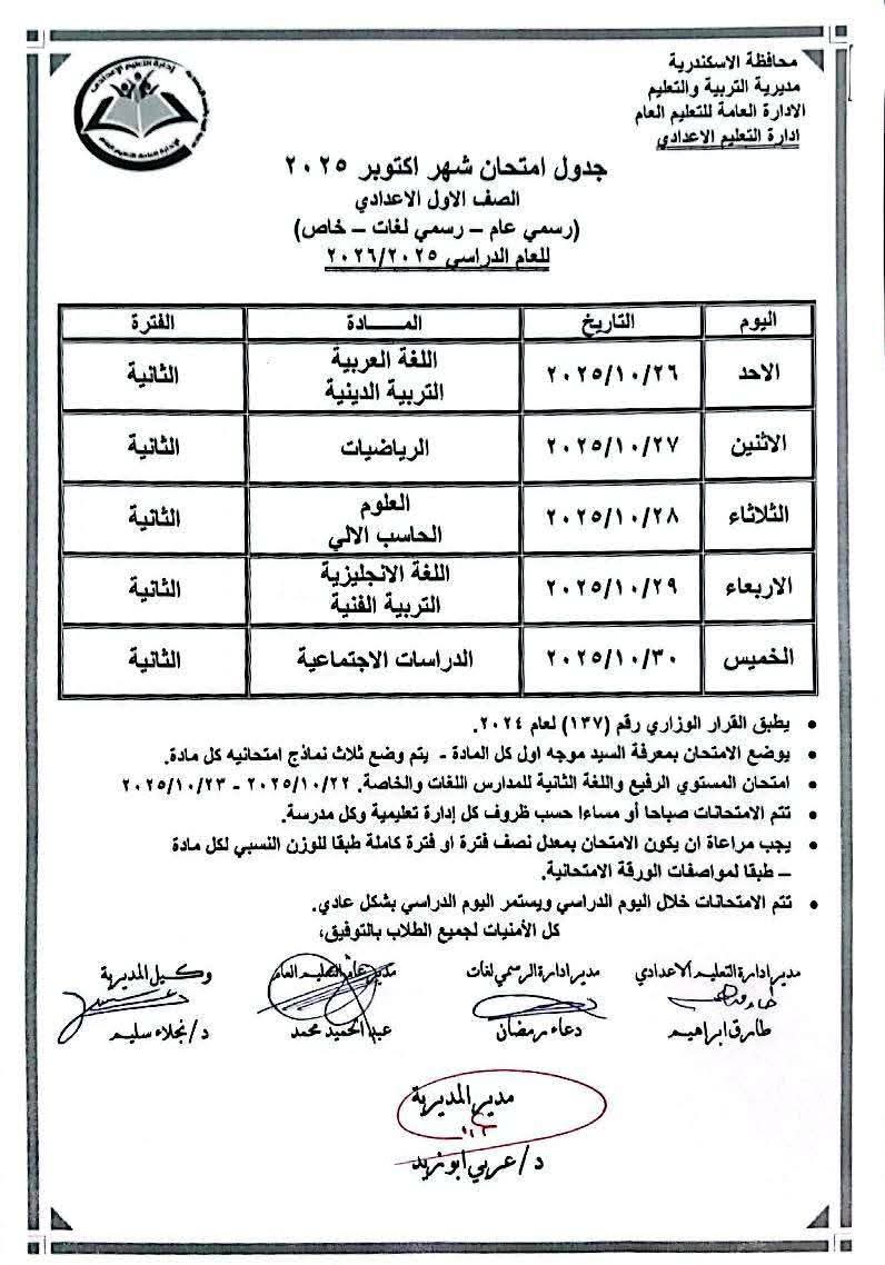 ويمكن الحصول على جدول امتحانات شهر أكتوبر 2025 لطلاب صفوف النقل بمحافظة الإسكندرية من خلال مطالعة الصور التالية: