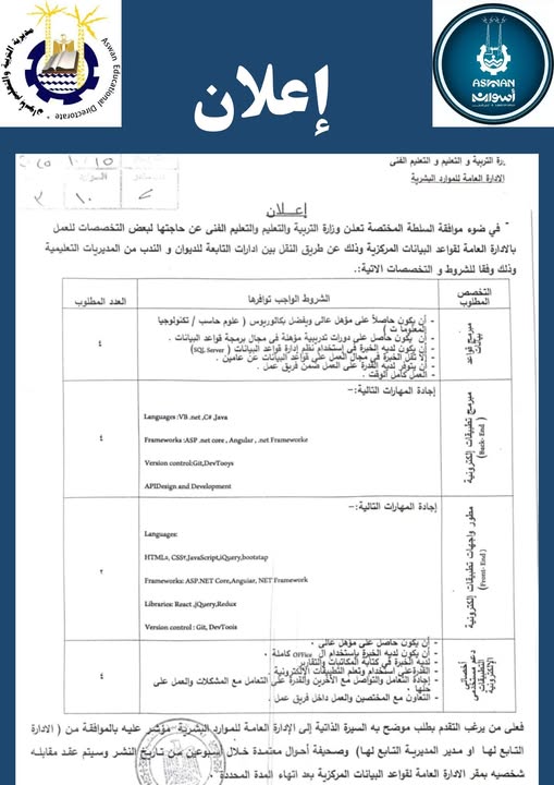 أعلنت وزارة التربية والتعليم والتعليم الفني عن حاجتها لشغل عدد من الوظائف بالإدارة العامة لقواعد البيانات المركزية، عن طريق النقل أو الندب من الإدارات التابعة للديوان والمديريات التعليمية، وذلك وفقًا للتخصصات والمهارات التالية: