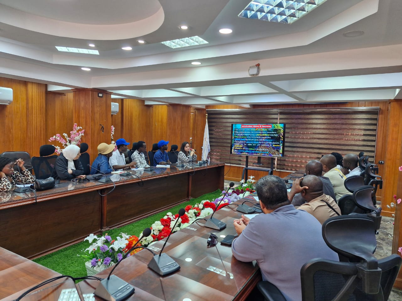 كما قام الدكتور خالد فاضل وولاء شوقي بتعريف الوفد بوحدة الطحالب والأنواع المستزرعة منها، بالإضافة إلى شرح حول أنواع الأسماك المستزرعة في المفرخ الخاص بالمحطة والطرق المتبعة في عمليات التفريخ.