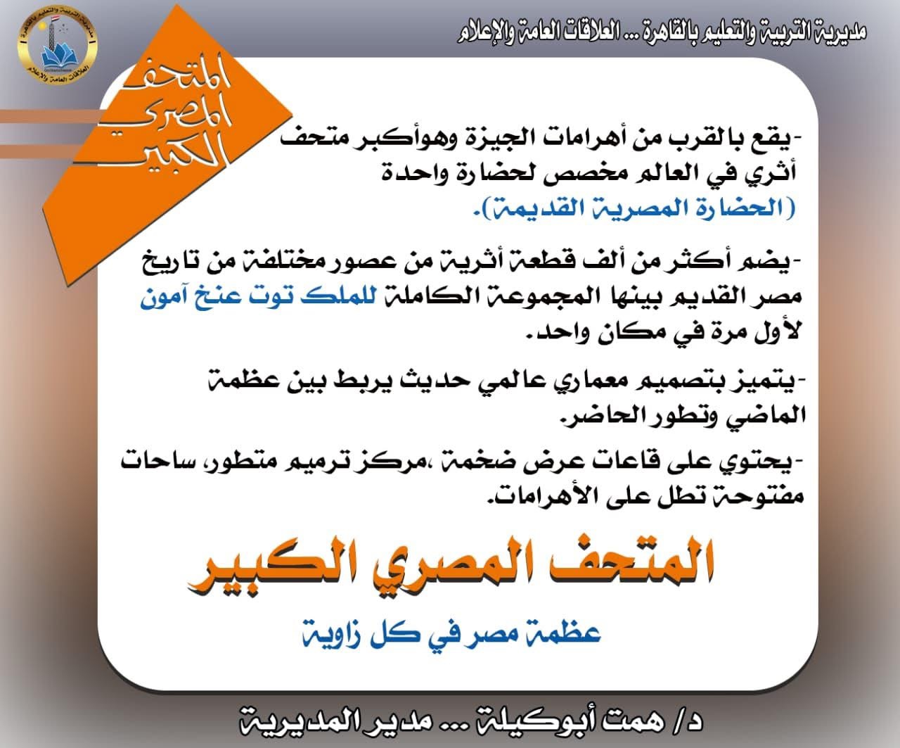 نشرت الصفحة الرسمية لمديرية التربية والتعليم بالقاهرة عبر موقع التواصل الاجتماعي «فيس بوك»، شرحًا مبسطًا لتعريف الطلاب بتفاصيل المتحف المصري الكبير.